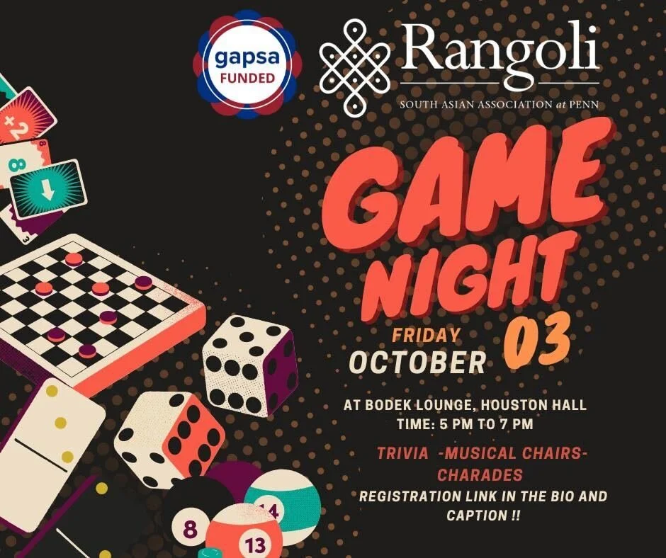 Come join Rangoli’s FIRST event of the year!! Game night will be held next Friday, October 3rd in Bodek Lounge :) We have multiple games and competitions to participate in, with chances to reconnect with old friends and make new ones! Please arrive promptly at 5pm to be sure to take part in all the activities (there will be prizes for the winners!) Please register via Eventbrite!! See you all there!