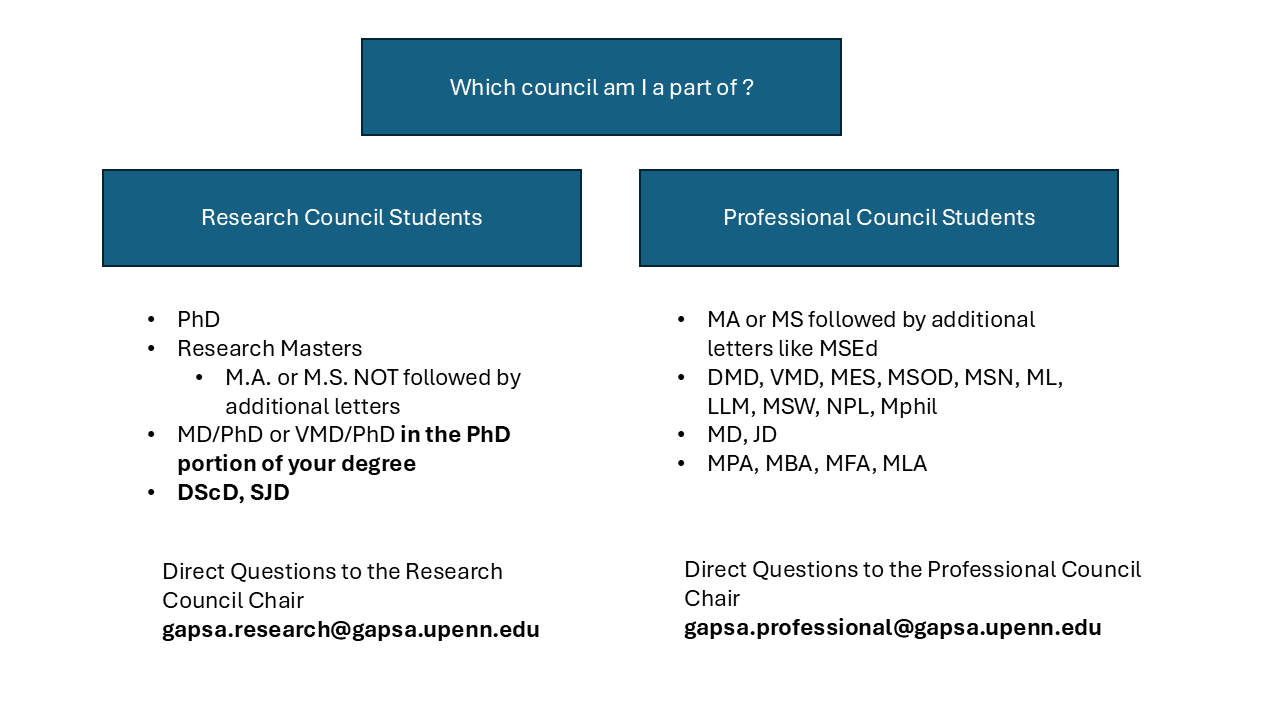 If you are in a professional or non-research Master’s program (including DMD, EdD, JD, MD, MSE, and MS programs with other letters), you are considered a professional student. If you are in a PhD program or a research Master’s program (AM or MS), you are considered a research student. Students in dual degree (e.g., MD/PhD, VMD/PhD) programs are considered professional students during their professional degree years and research students during their PhD years. Please refer to this flowchart or email gapsa.funds@gapsa.upenn.edu if you are unsure about your status.